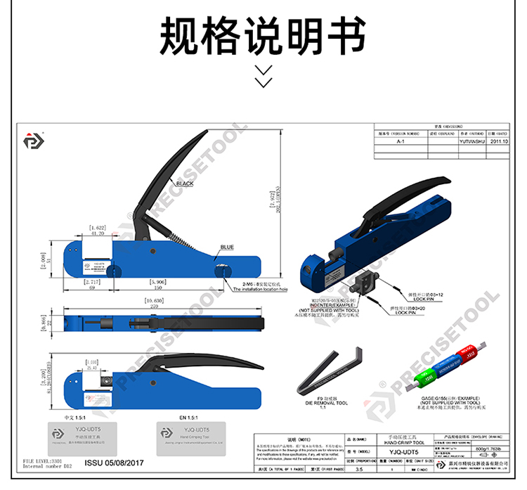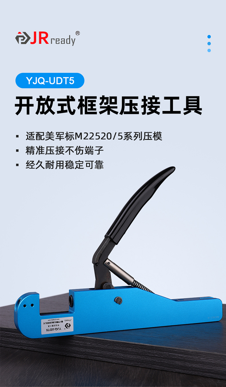 YJQ-UDT5 在M22520/5-01的基础上改进反向握持并可以配合底座在桌面上固定使用的一款开放式框架手动压接工具,用于压接各种尺寸和种类金属环、同轴连接器、接触体、结合体及电线端子座。带行程锁定装置,保证重复作业高可靠性的压接质量。